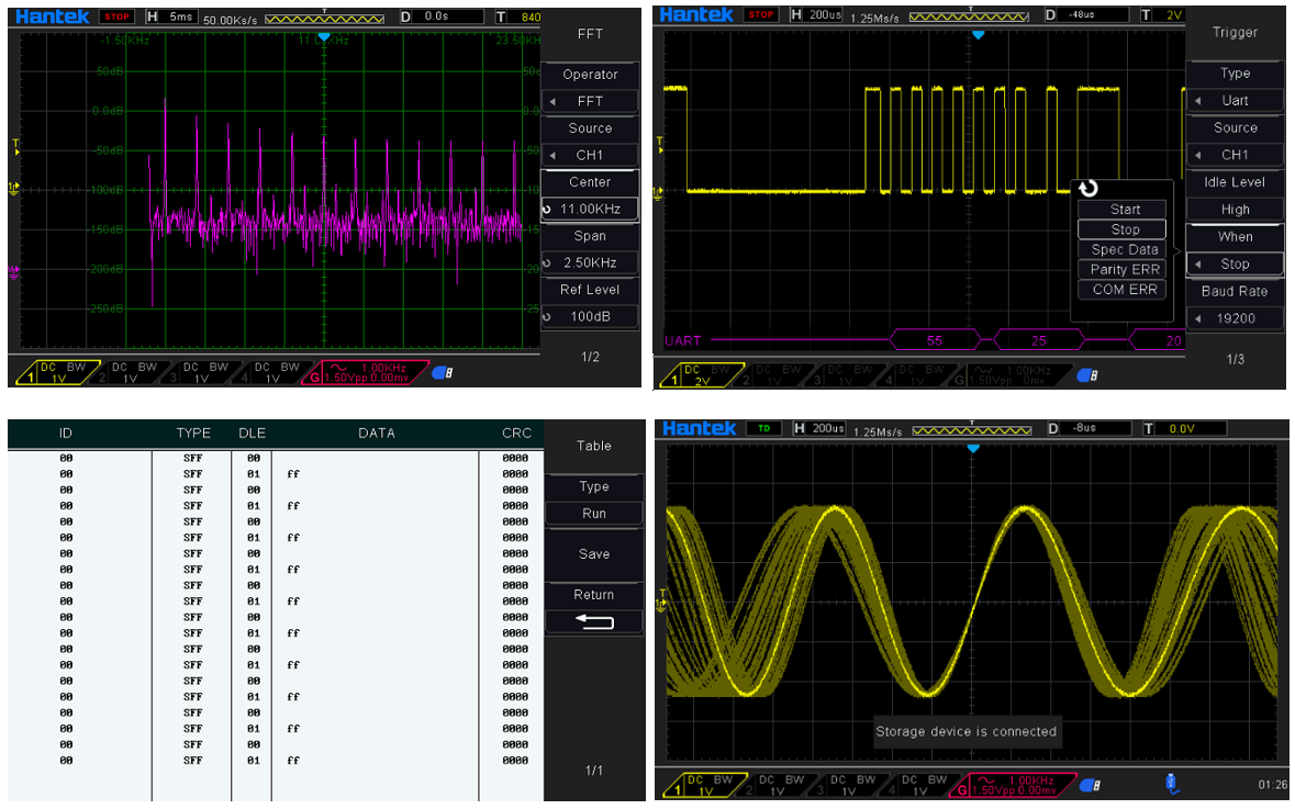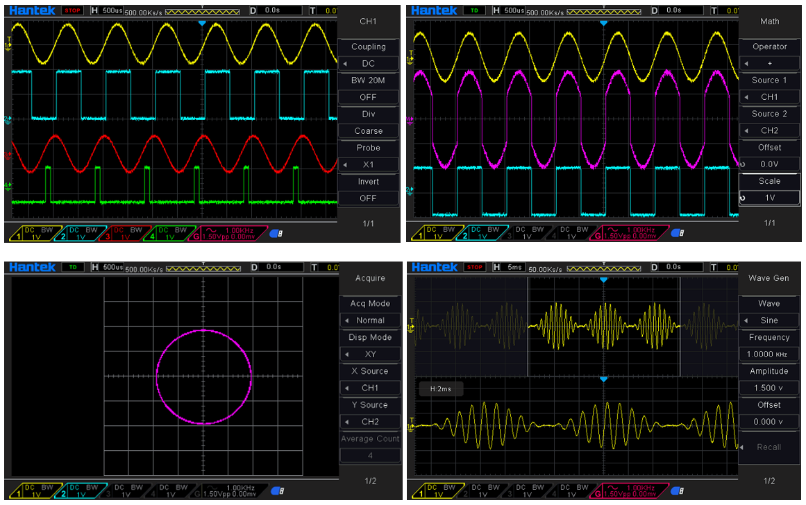 Hantek Thailand ออสซิลโลสโคปแบบตั้งโต๊ะความละเอียดสูงแบบ 4 ช่อง แบนด์วิดธ์ 80 – 250 MHz อัตราการสุ่มสัญญาณสูงสุด 1 GS/s ความละเอียด 8 บิต มี Auto Measurement มากกว่า 32 แบบ ฟังก์ชั่นทริกเกอร์มากกว่า 14 ชนิด จอแสดงผลมีขนาด 7 นิ้วแบบ TFT 64 ล้านสี รองรับการควบคุมการสั่งการระยะไกลของ SCPI