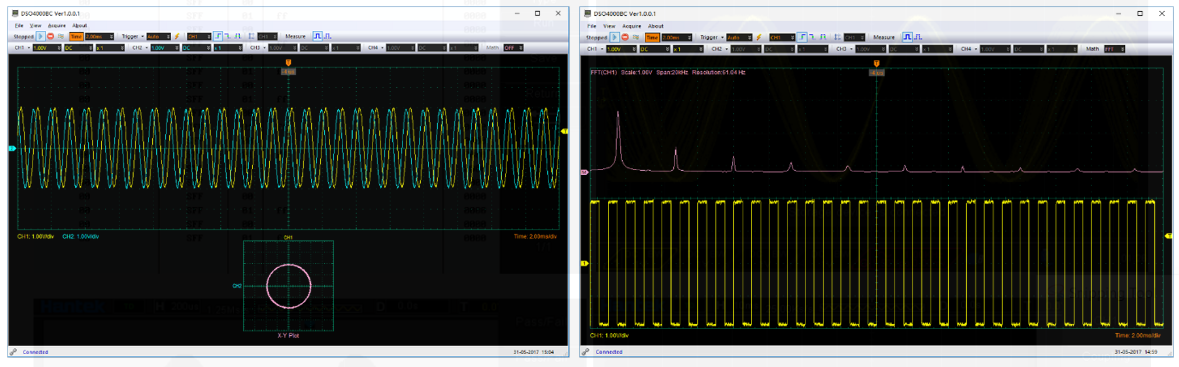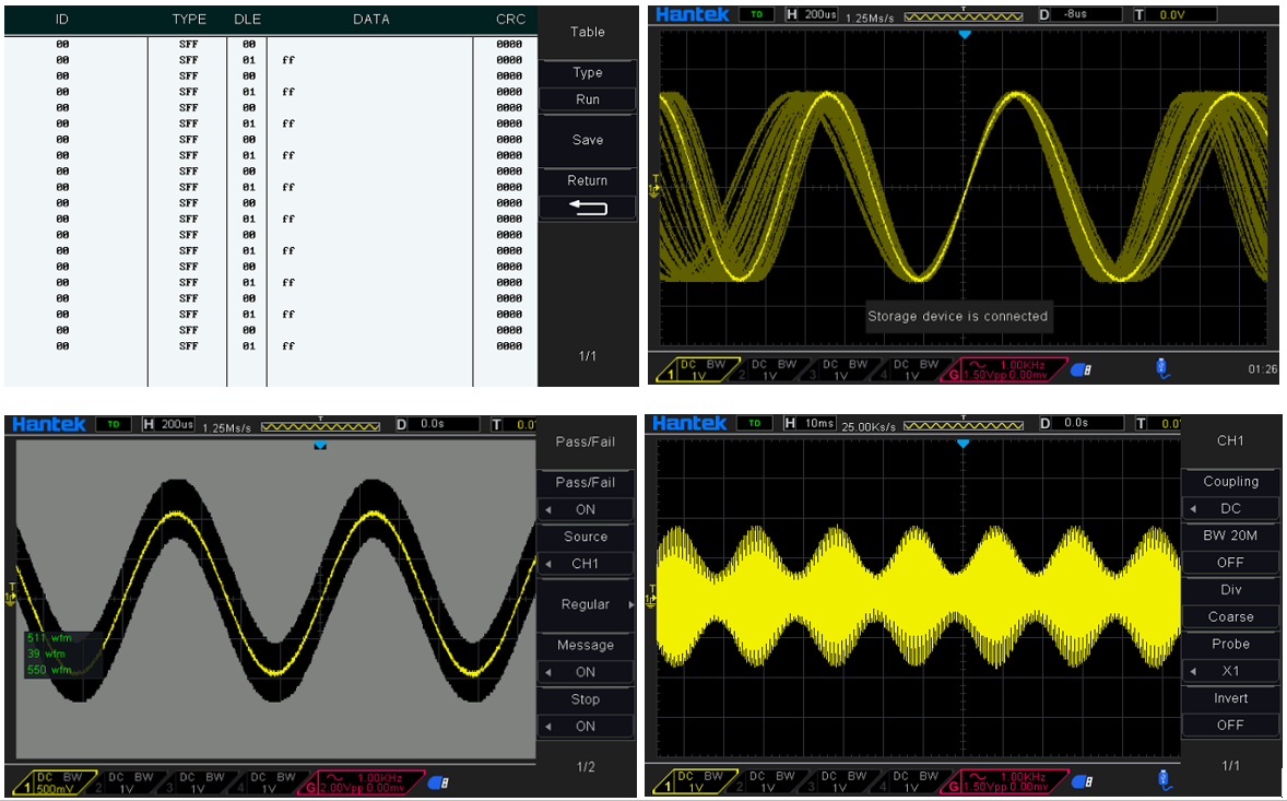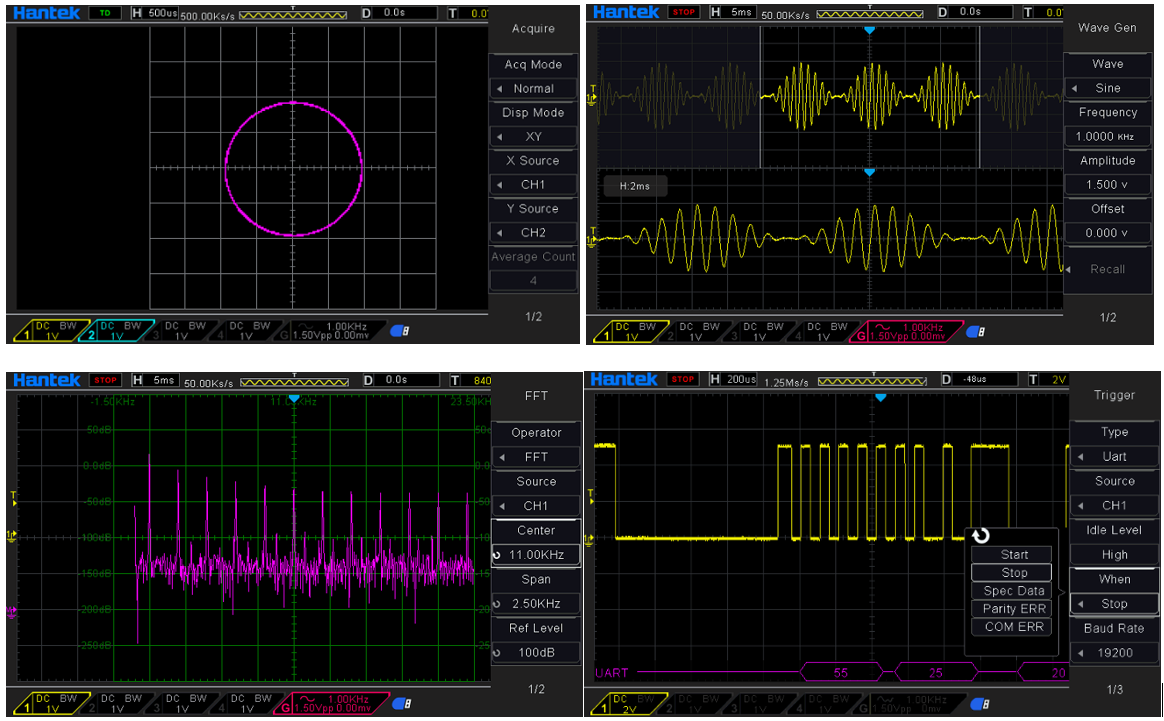 Hantek Thailand ออสซิลโลสโคปแบบตั้งโต๊ะความละเอียดสูงแบบ 4 ช่อง แบนด์วิดธ์ 80 – 250 MHz อัตราการสุ่มสัญญาณสูงสุด 1 GS/s ความละเอียด 8 บิต มี Auto Measurement มากกว่า 32 แบบ ฟังก์ชั่นทริกเกอร์มากกว่า 14 ชนิด จอแสดงผลมีขนาด 7 นิ้วแบบ TFT 64 ล้านสี รองรับการควบคุมการสั่งการระยะไกลของ SCPI